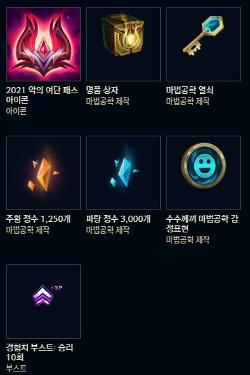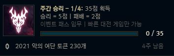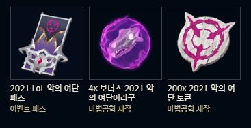 | 3 | 챔피언 처치 관여 30회 달성 또는 게임 4회 플레이 | 2021 악의 여단 토큰 20개 |