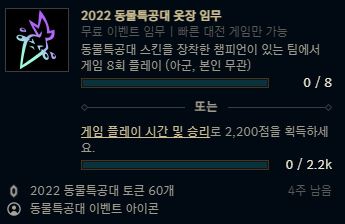 | 리그오브레전드 2022 별 수호자 이벤트 패스 업적, 임무, 물품 정리 (1) | 2022.07.15 |