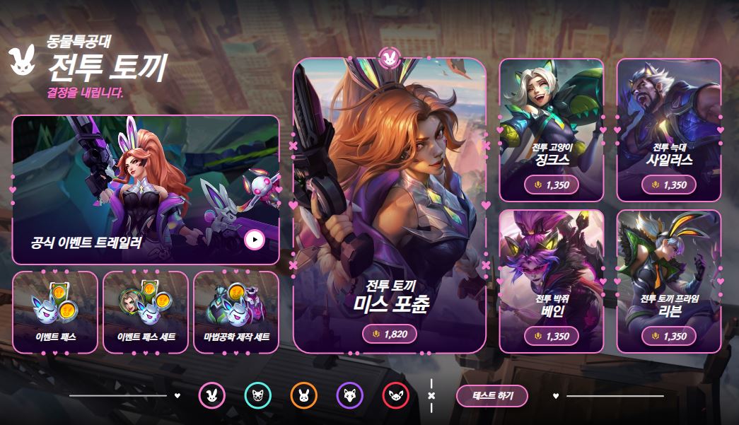 가격: 2022 동물 특공대 토큰 2000개 (신화급) 출시일: 2022년 12.6 패치 스킨 시리즈: 동물 특공대 동물 특공대 시리즈 1차 (12.6 패치) : 전투 토끼 미스포츈(전설급) 전투 토끼 프라임 리븐 전투 박쥐