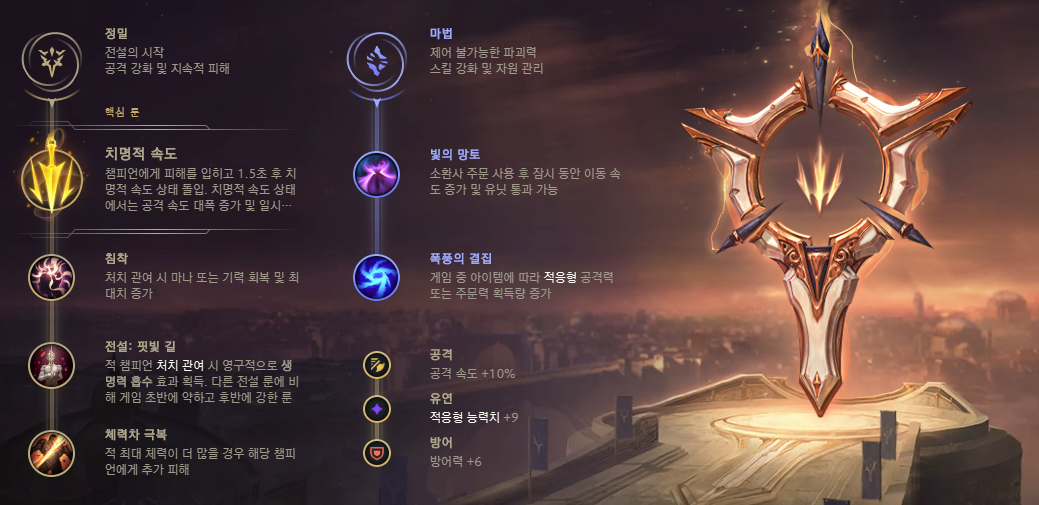 강력한 데미지와 바텀 라인전에서의 강한 푸쉬력으로 빠른 포탑 철거에 기용되는 룬입니다.