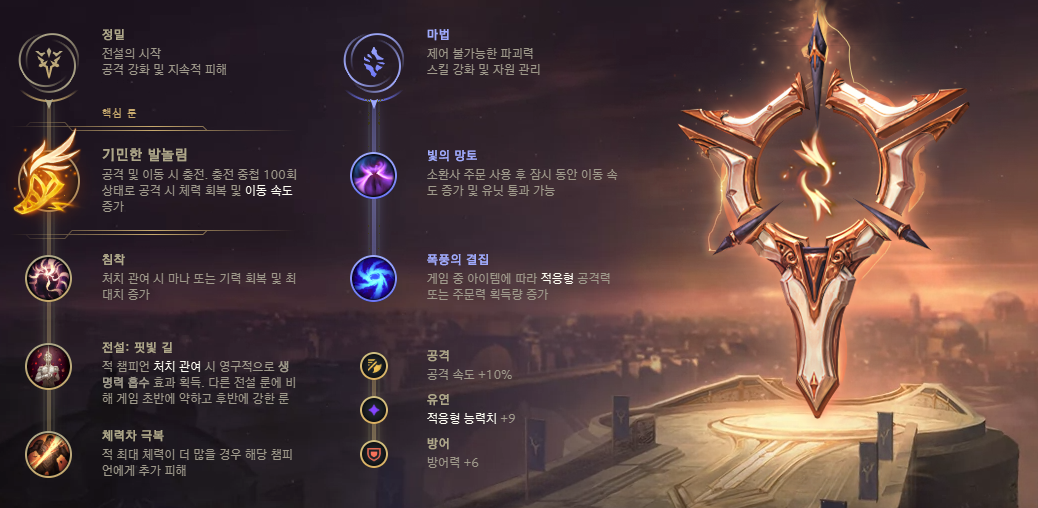 빛의 망토로 생존력과 추격, 폭풍의 결집으로 후반 강한 영향력을 행사 할 수 있습니다.