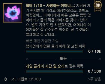 | 1. 사랑하는 어머니 | 챔피언에게 입힌 물리 & 고정 피해 10,000 달성 또는 목표 점수 300점 획득 |