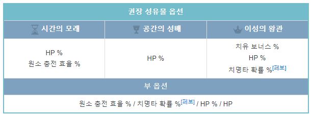 | 기본 | HP% / 원충 | HP% | HP% / 치유 | 26000 | 170+ | 30 |