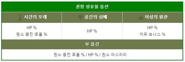 | 기본 | HP% / 원충 | HP% | 치유 / HP% | 42000+ | 180% | 30 |