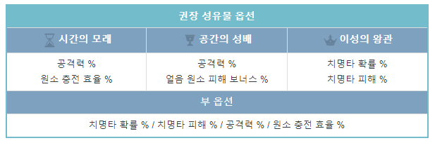 | 에일로이 | 시계 | 성배 | 왕관 | 공격력 | 원충 | 치확/치피 |
