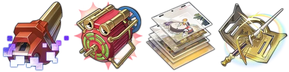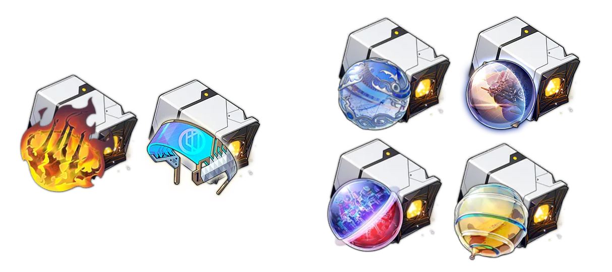 | 머리 | 핸드 (=장갑) | 바디 | 신발 | 차원 구체 | 연결 매듭 |