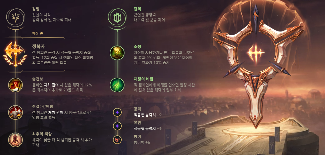 정복자를 이용해 강력한 라인전과 후반 강력한 힘을 발휘할 수 있습니다.
