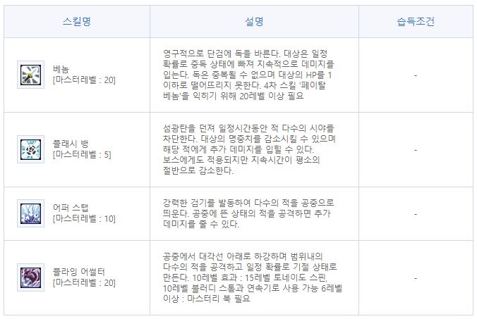 | 팔라딘 | 아크메이지(불,독) | 신궁 | 섀도어 | 캡틴 | |
