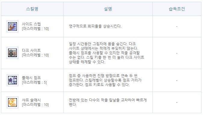 | 이동기 | 플래시 점프(트리플 점프), 블레이드 어센션(유사 윗점프) |