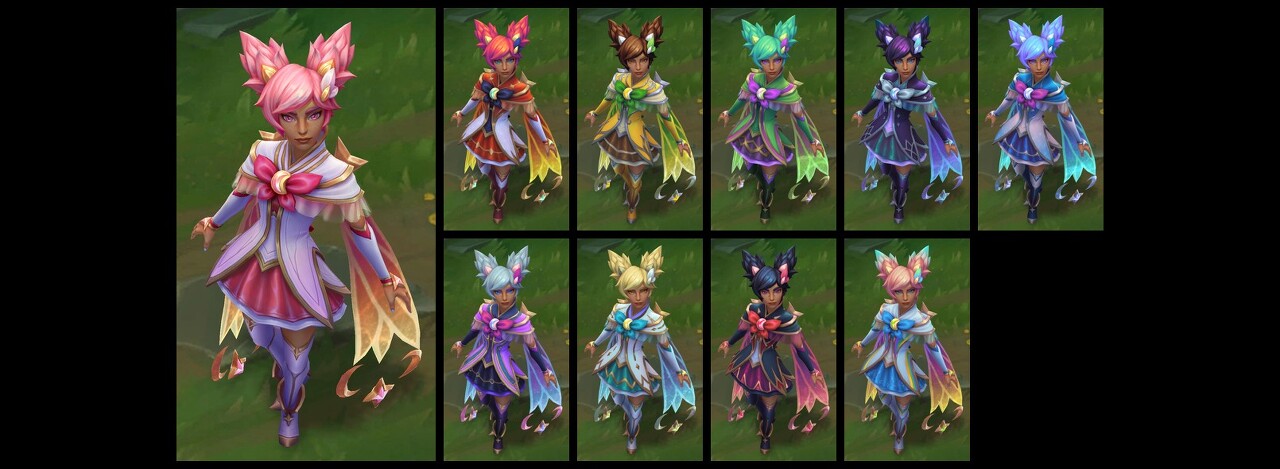 가격: 1350RP (서사급) 출시일: 2022년 12.14 패치 스킨 시리즈: 별 수호자 별 수호자 시리즈 시즌1 (6.20 패치) : 별 수호자 징크스(전설급) 별 수호자 럭스 별 수호자 룰루 별 수호자 뽀삐 별 수호자 잔