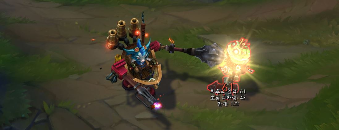 치명타 공격의 경우 럼블이 더 큰 동작을 취하게 됩니다.
