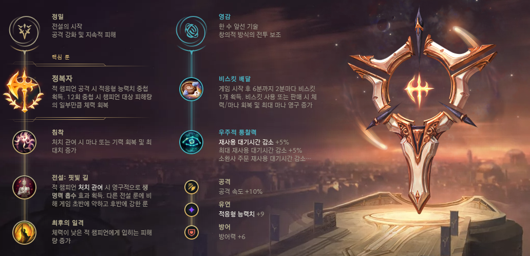 라인전에서는 치명적 속도를, 한타를 위해서는 정복자를 추천드립니다.