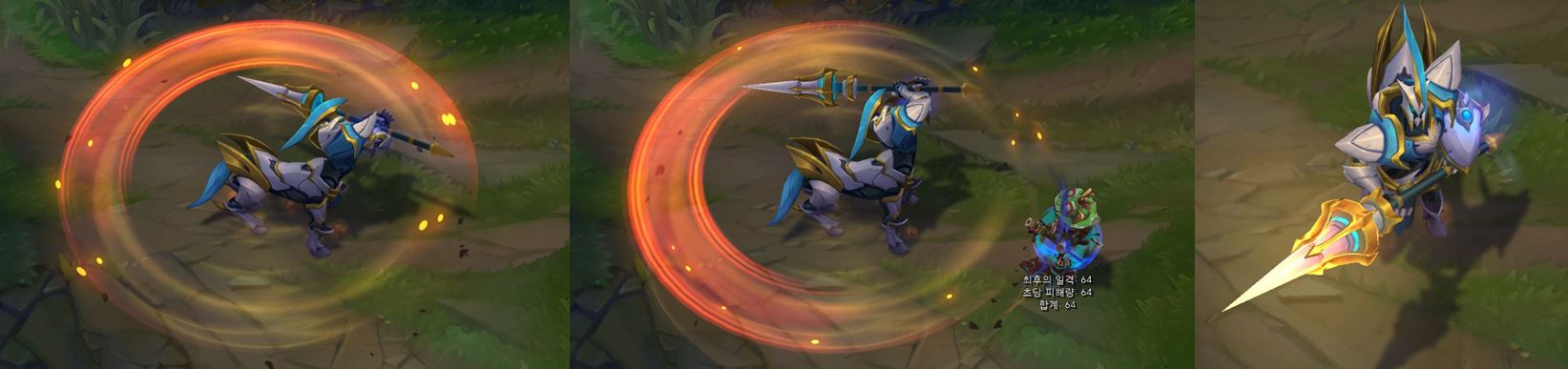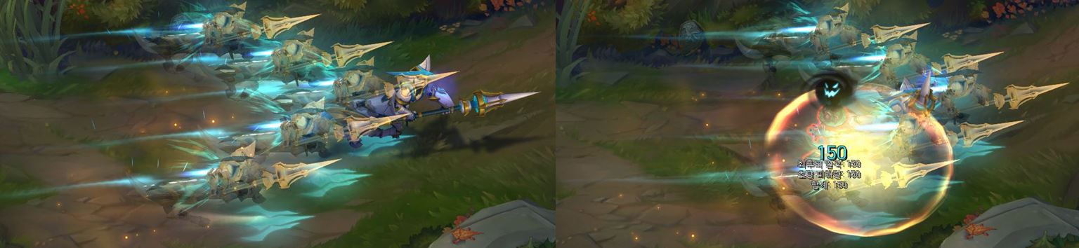 기본 공격은 창을 좌우로 흔들며, 주황색으로 이펙트가 나타납니다.